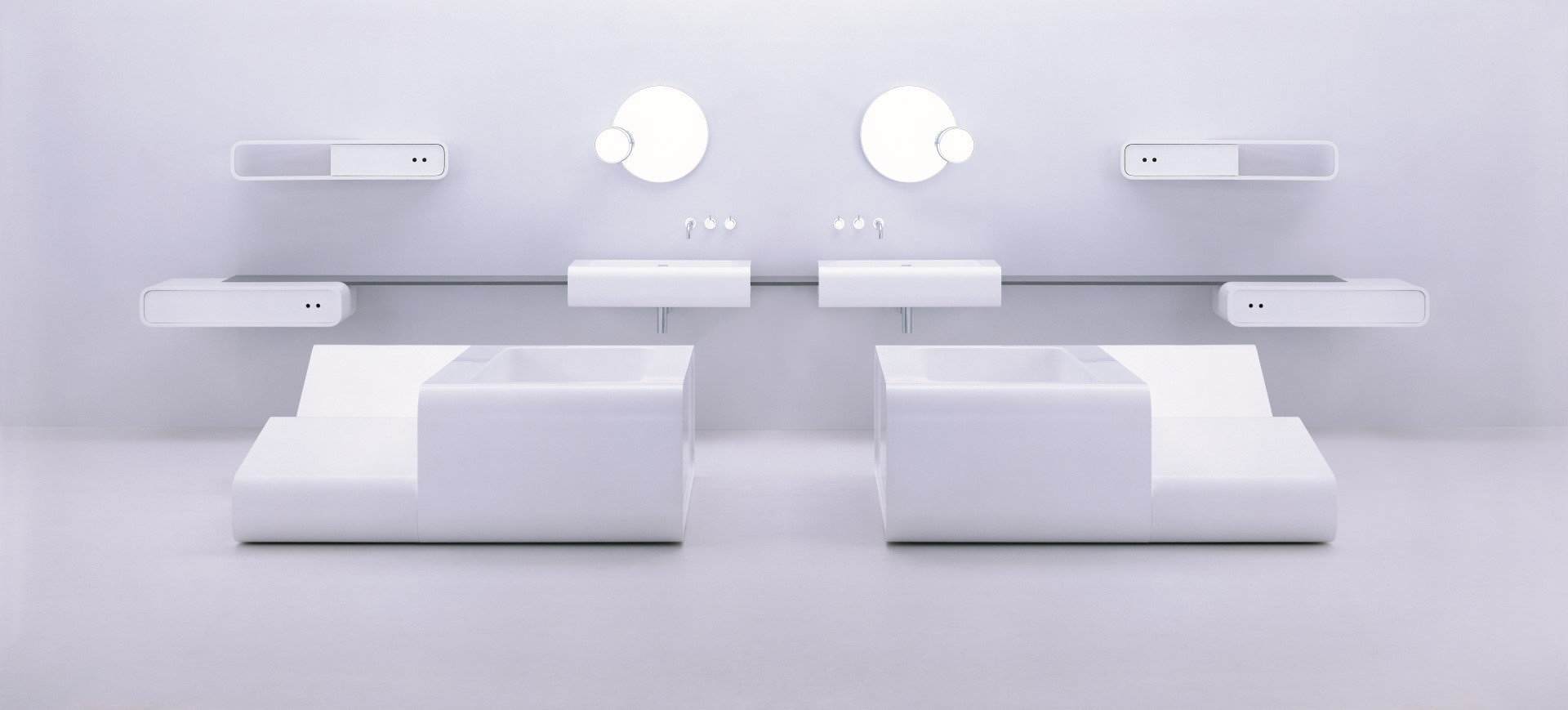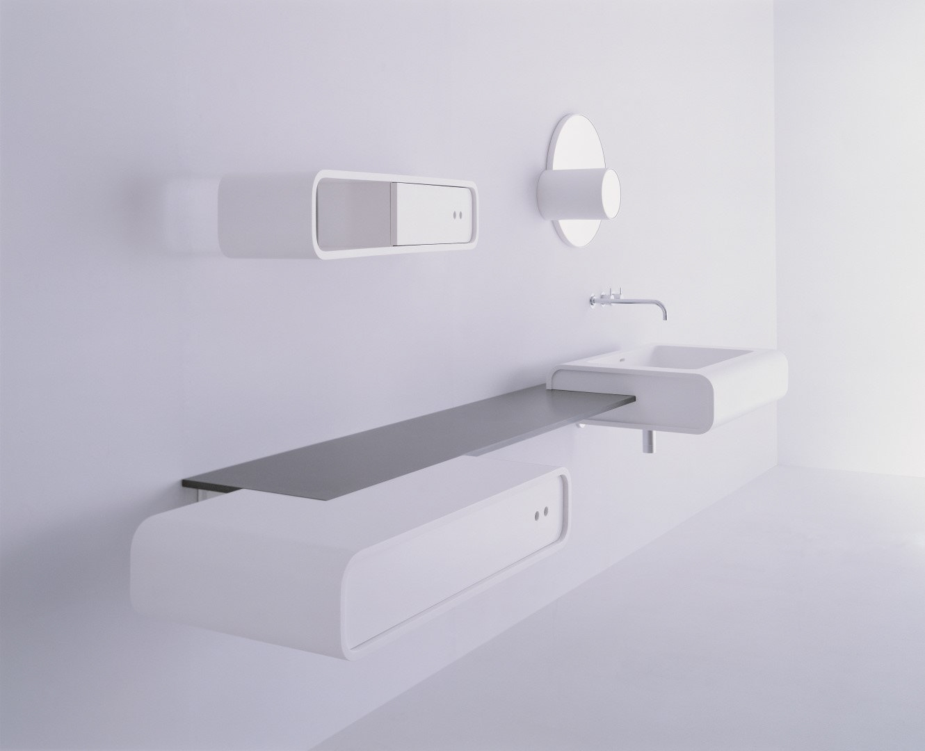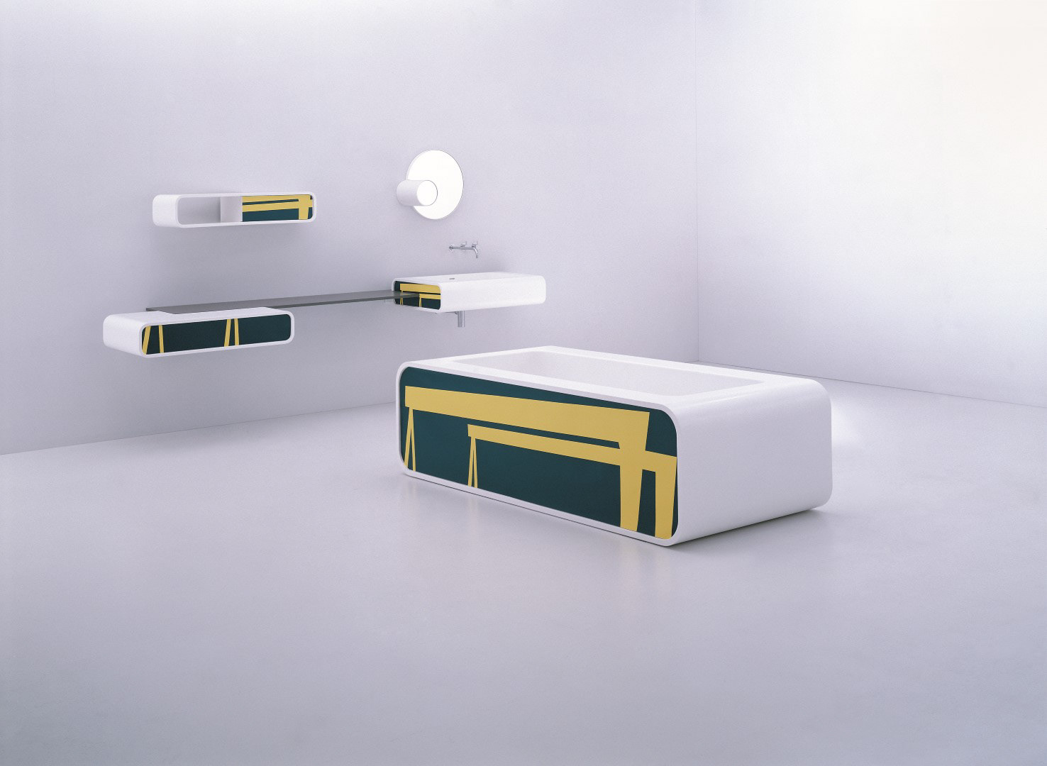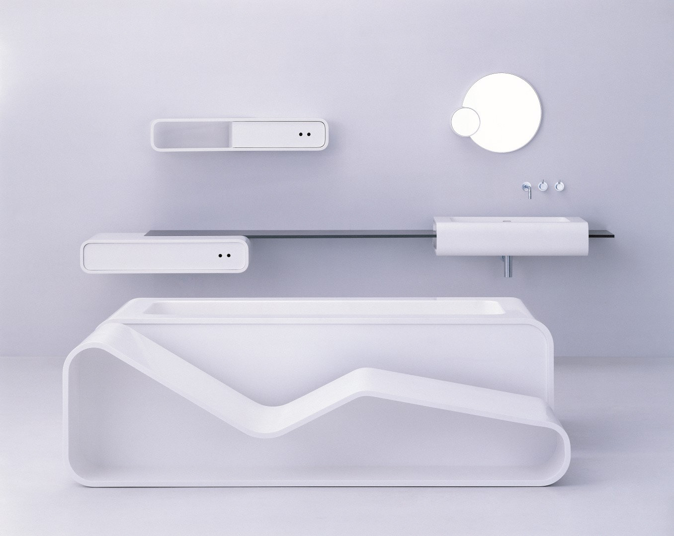 Solid forms are suspended from a thin reconstituted stone shelf with bath and lounger.